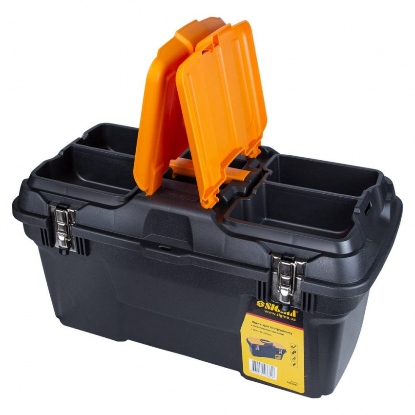 Ящик для інструментів (металеві замки) 582×310×234мм Sigma (7403681) Призначений для зберігання, транспортування, перенесення та зручного доступу до ручного інструменту. Допомагає системно організувати зберігання дрібних деталей: кріплення, шайб, гайок та інших дрібниць. Простота пошуку необхідних деталей забезпечується наявністю кількох секцій. Функціональний та знаходить застосування у багатьох сферах діяльності: перенесення індивідуальних інструментів, комплектація наборів інструментів та дрібних деталей для домашнього майстра, укладання дрібних предметів на відпочинку – рибалці, полюванні, рукоділлі; при комплектації необхідного набору інструментів та аксесуарів для автомобіля, майстерні, гаража або СТО та ін.