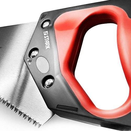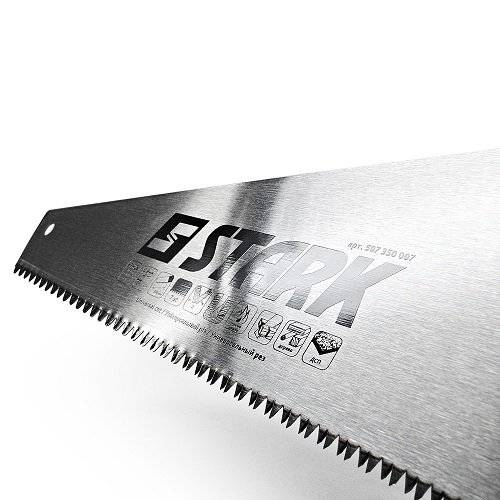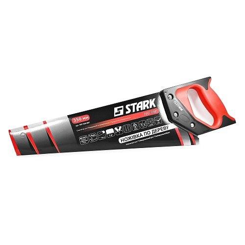 Stark 350 мм – ножівка для роботи з деревом, легко відпиляє гілки з дерев, розпиляє дошку або будь-яку іншу дерев'яну заготовку. Полотно з розведеними 7 зубами/дюйм для якісного пиляння без тертя об стінки розпилювальної канавки.