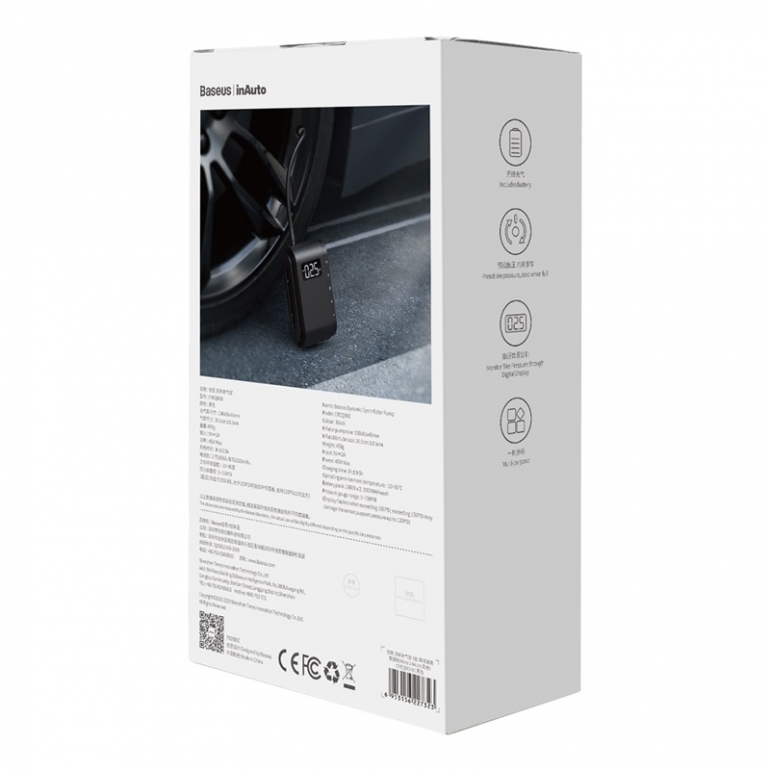 Baseus Dynamic Eye CRCQB03-01 – зручний у використанні автомобільний компресор невеликих габаритів. У комплекті до насоса йдуть насадки для накачування шин автомобіля, велосипеда, мотоцикла та м'яча. Компресор керується за допомогою клавіш на пластиковому корпусі, має цифровий дисплей та вбудований акумулятор ємністю на 4000 мАг. Повна зарядка акумулятора компресора здійснюється за допомогою кабелю з роз'ємом типу USB від мережі живлення протягом 3 годин.