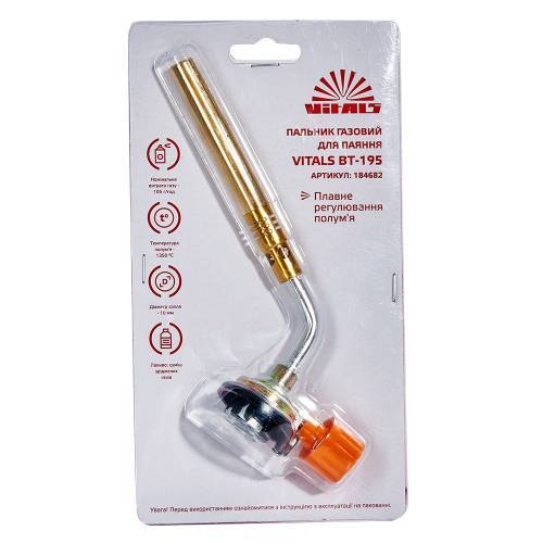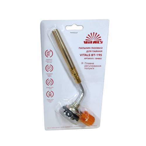 Пальник газовий для пайки Ø14 мм Vitals BT-195 призначений для розпалювання багать та мангалів, хобі та моделювання, паяння з'єднань труб, видалення фарби, розігріву замерзлих водопровідних труб.