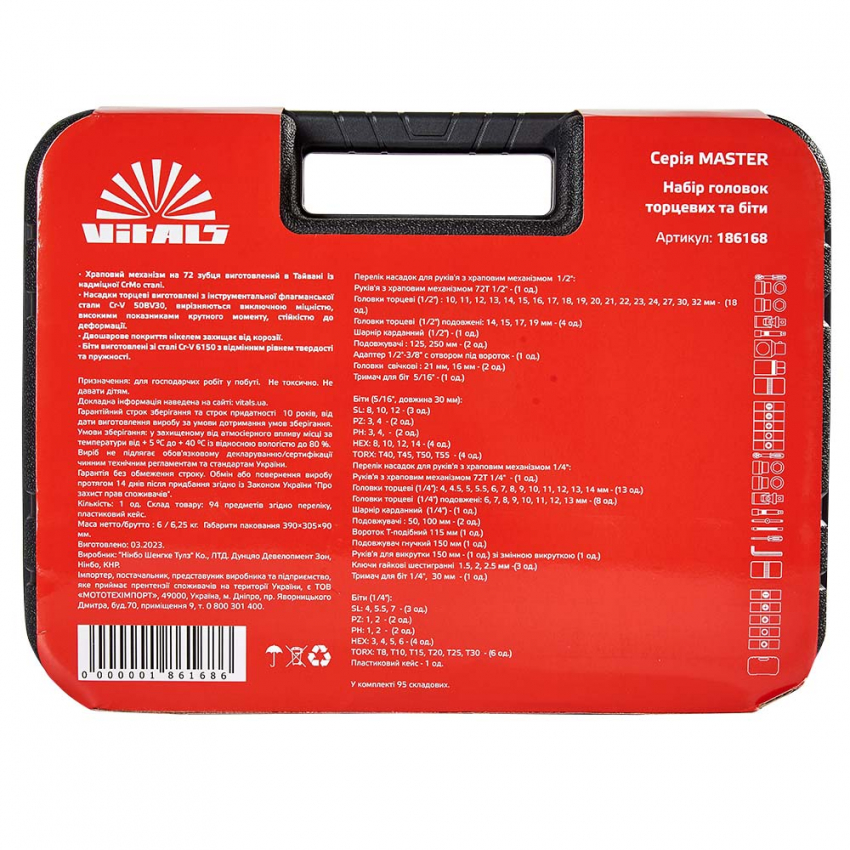 Комплектація набору головок торцевих 1/4″ та 1/2″ 94 предмети Vitals Master