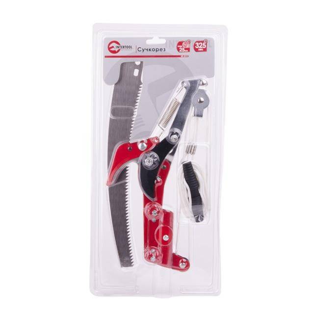 Цей універсальний інструмент включає в себе гілкоріз і ножівку по дереву. Призначений для спилювання гілок, паростків, формування крони дерев, а також для обрізки сухих гілок у важкодоступних місцях і на великій висоті. Застосовується разом з телескопічною ручкою INTERTOOL HT-3112.