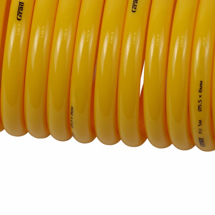 Шланг спіральний PU 5м 5.5×8мм GRAD (7011715) використовується для передачі повітря у пневматичних системах стандартного тиску. Має хорошу стійкість до механічних впливів (перегини, стискання, скручування) і швидко відновлює свою первинну форму після зняття механічної дії. Шланг не схильний до гідролізу і має хорошу стійкість до впливу озону, масел, палива та мікроорганізмів.