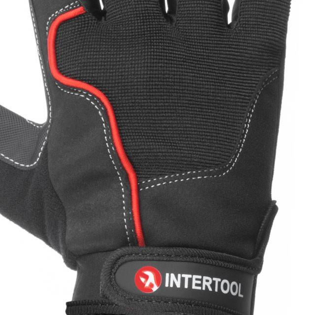 Рукавички без пальців INTERTOOL SP-0145 виготовлені з високоякісної екошкіри із захисними вставками на долоні та зі вставками зі спандекса і неопрену на тильній стороні. Ця модель багатоцільова і може використовуватися для виконання монтажних робіт, як водійські рукавички для авто-, мото- або велотехніки. Також знадобляться для різних видів спорту: важкої атлетики, паверліфтингу, бодібілдингу та інших силових тренувань. У воєнний час можуть використовуватися як тактичні рукавички.