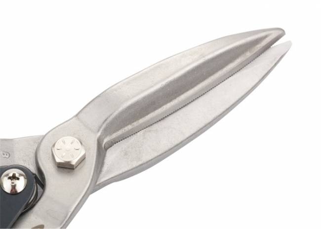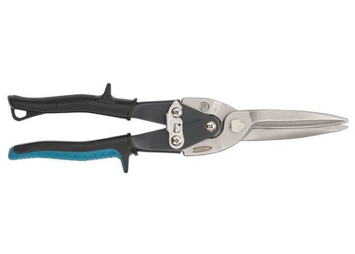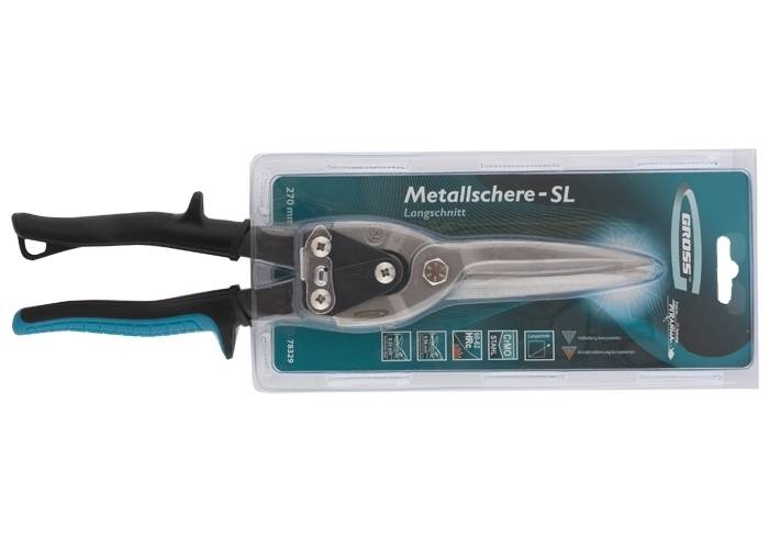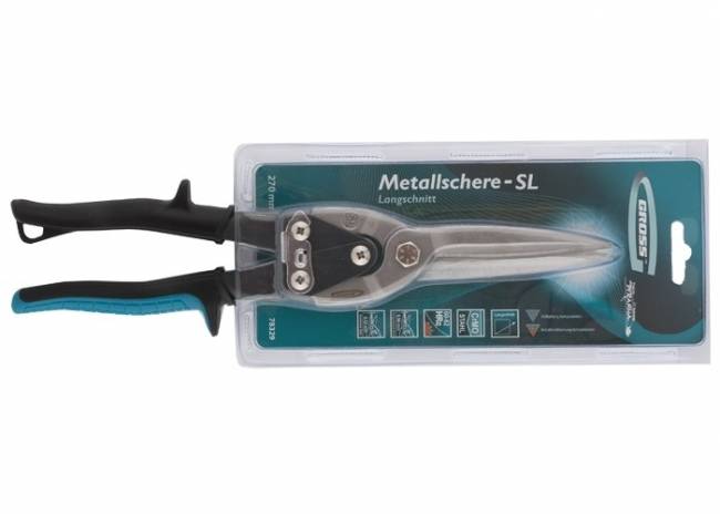 Ножиці по металу марки GROSS призначені для точного прямого прохідного різання листового металу завтовшки до 0,94 мм і нержавіючої сталі завтовшки до 0,53 мм. Робочі частини ножиць виготовлені з високолегованої сталі (CrMo), вміст молібдену та ванадію у її складі надає необхідної жорсткості та високої жорсткості. Ріжучі губки проходять процес індукційного гарту і мають жорсткість 60-62 HRС. Ножиці загальною довжиною 270 мм оснащені ергономічними двокомпонентними ручками, оригінальна форма яких мінімізує ризик травм та забезпечує зручність при тривалих роботах.