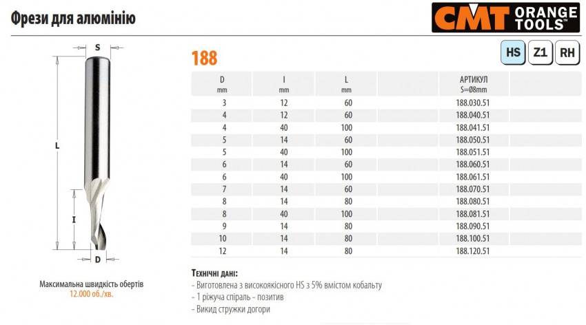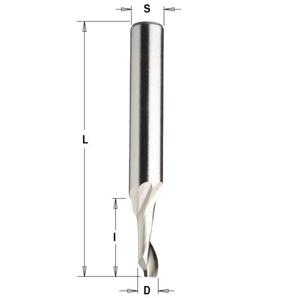 ЗАСТОСУВАННЯ: Будова із однією ріжучою граню дозволяє досягнути чистий і швидкий різ в алюмінієвих сплавах і пластику. Дана фреза працює більш ефективно порівняно із прямою фрезою. Також вона має загострений торець, що дозволяє засвердлюватися у матеріал. Може застосовуватись на верстатах з ЧПУ та ручних фрезерах, із встановленням у відповідний патрон та цангу. - Виготовлена із високоякісного HSS 5% - им вмістом кобальту; - 1 ріжуча спіраль - позитив; - Максимально 12 000 об/хв; - Викид тирси вгору.