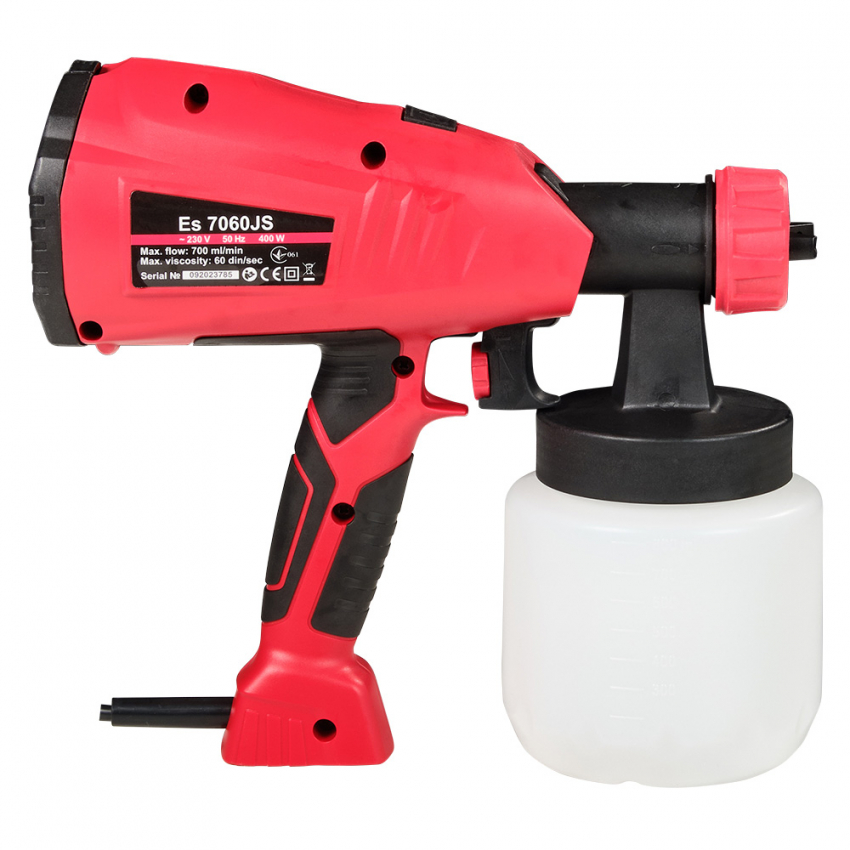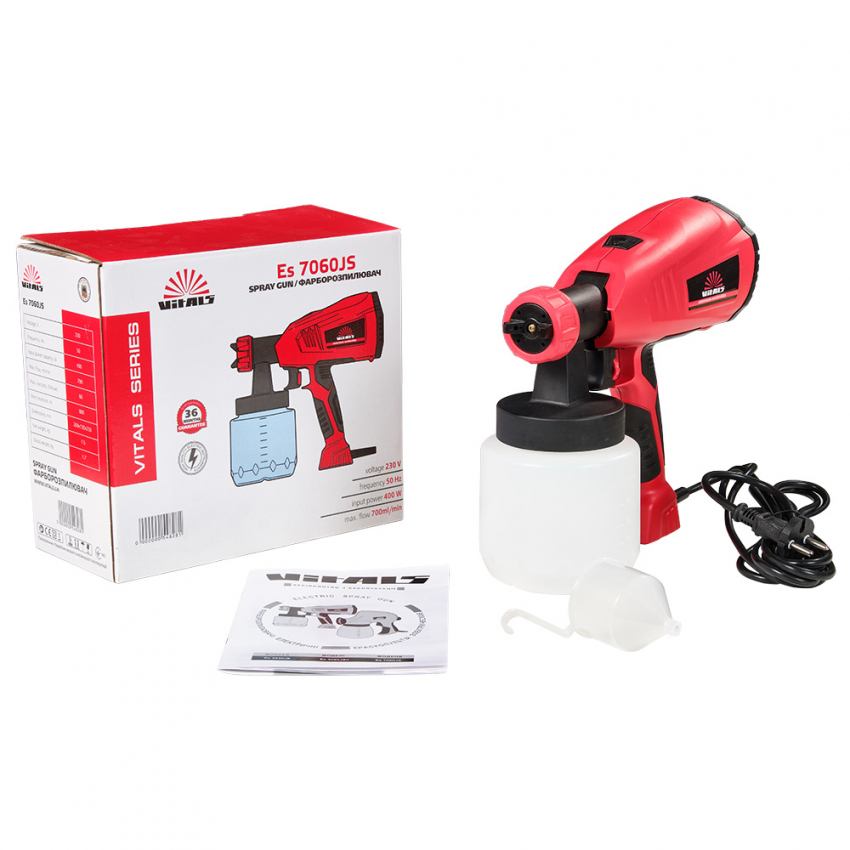 Електричний фарбокопульт Vitals Es 7060JS спроектований з дотриманням усіх вимог безпеки та надійний в експлуатації. Розпилювач призначений для нанесення фарби, лаку та інших розчинних матеріалів у відповідній в'язкості на різних поверхнях. У фарбопульті Vitals Es 7060JS використовується сучасна, економічна та екологічна система нанесення ЛКМ методом розпилення. На відміну від систем розпилення з високим тиском, вона забезпечує розпилення матеріалу великим об'ємом, а не тиском повітря (при низькому тиску). Це впливає на: збільшення продуктивності; нанесення захисних покриттів на різні поверхні; яка зафарбовується; низькі втрати в умовах туманоутворення і відштовхування фарби від поверхні; можливості фарбування будь-якої конфігурації з будь-яким матеріалом. Джерелом електропостачання фарбопульта служить однофазна мережа змінного струму напругою 230 В і частотою 50 Гц. , який виготовляється з ним, нагнітається в бачок, що згодом видавлює ЛКМ через сопло. Інструмент є побутовим, призначений для виконання невеликих обсягів робіт, надійний у роботі, простий в експлуатації та обслуговуванні.