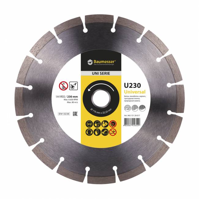 Алмазний сегментний диск Baumesser 1A1RSS/C3-H Universal є універсальним інструментом для роботи з широким спектром матеріалів. Найкраще показує себе у роботі з неармованими бетонами будь-якої твердості. На ринку представлений у трьох варіантах, діаметром 115, 125 та 230мм. Створено для роботи на УШМ та інших інструментах зі стандартним посадковим місцем у 22,23 мм. Baumesser 1A1RSS/C3-H Universal