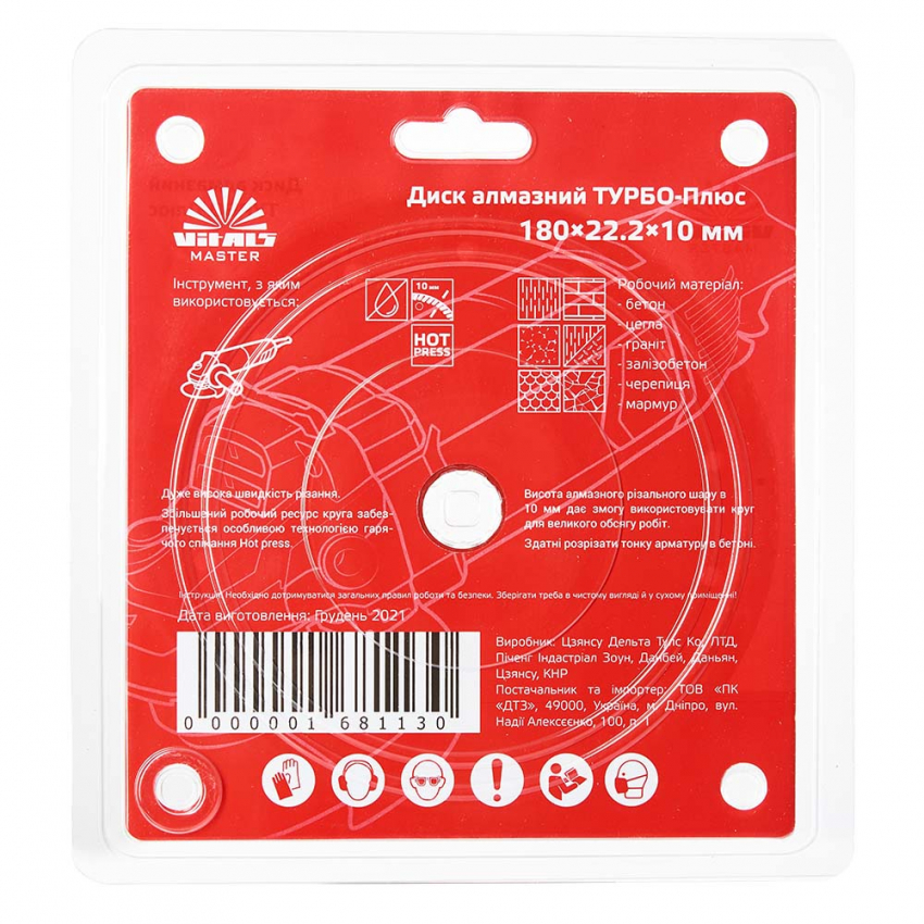 Диск алмазний Vitals Master ТУРБО-Плюс 180 мм використовується для роботи з такими матеріалами, як: бетон, цегла, граніт, залізобетон, черепиця, мармур. Висота алмазного різального шару становить 10 мм, що дає змогу використовувати круг для великого обсягу робіт.
