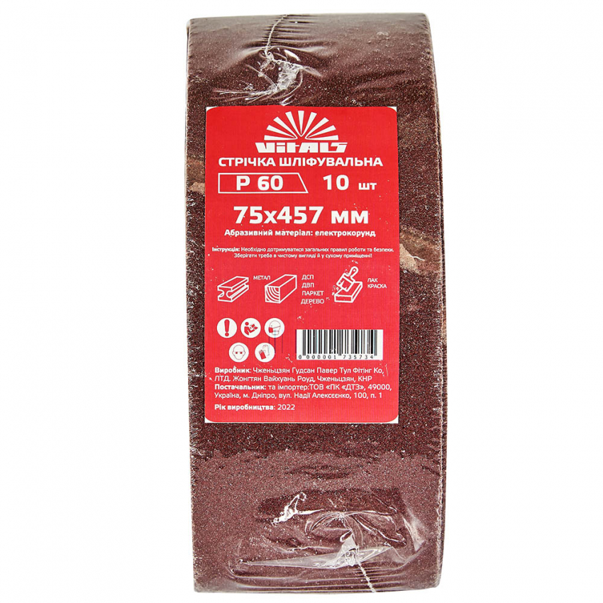 Стрічка шліфувальна Vitals 75х457 мм призначена для робіт з ДВП, ДСП, твердою деревиною, паркетом, лакофарбовими покриттями, металом.