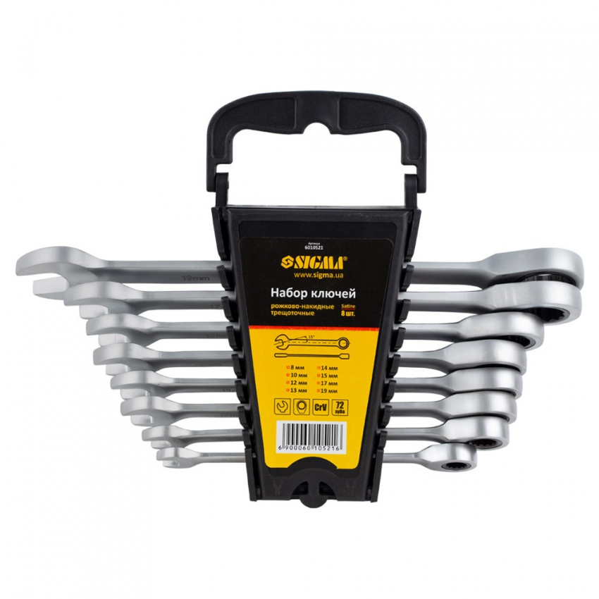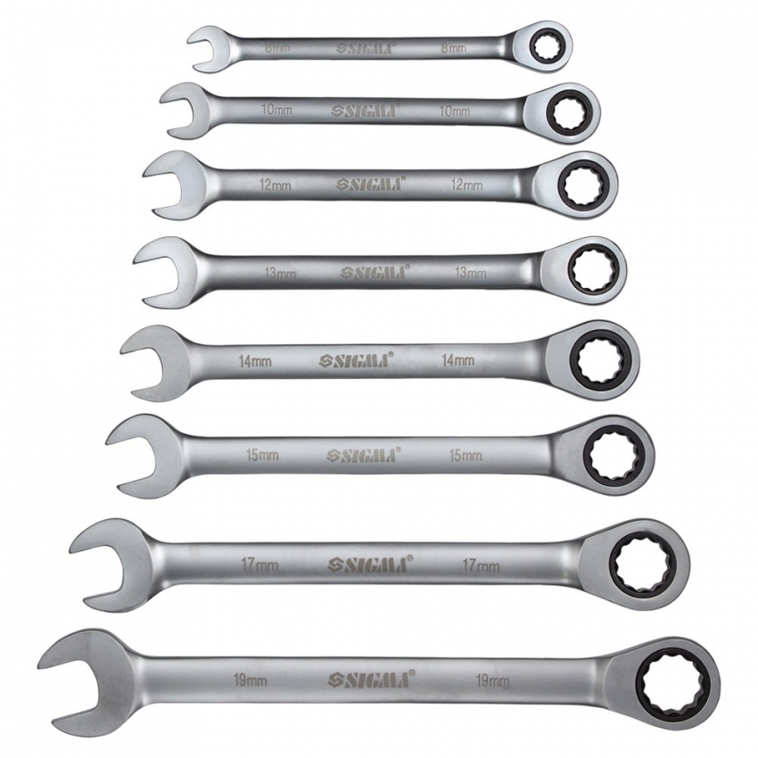 Набір ключів ріжково-накидних тріскаточних 8шт (8, 10, 12 ,13, 14, 15, 17, 19мм) Рожковий ключ забезпечує більший робочий діапазон у важкодоступних місцях. Накидний ключ охоплює кріпильну деталь з усіх боків і повторюючи її профіль, дозволяє майстру докладати зусилля, не побоюючись зриву інструменту, знижуючи ризик деформації чи пошкодження гайки. Використовувати його можна за наявності вільного доступу до гайок. Дванадцятигранна накидна частина оснащена тріскачковим механізмом на 72 зуби і забезпечує м'який і плавний хід (дозволяє повертати ключ із кроком 5° при роботі). Виготовлений із високоякісної хромованадієвої сталі, що забезпечує довгий термін служби ключа. Переваги: Хромованадієва сталь; Сатинове покриття; 72-зубцевий механізм, що забезпечує високий крутний момент; Кут переміщення механізму 5° дозволяє використовувати інструмент у вузьких і важкодоступних місцях; Головка накидного ключа з храповим механізмом усуває необхідність щоразу встановлювати ключ на елемент кріплення; Робота з будь-якими різновидами шестигранного кріплення; Збільшена площа зіткнення робочих поверхонь; Зниження ризику деформації граней кріплення під час монтажу; Міцність та надійність. Придбати набір ключів Sigma Ви можете, оформивши замовлення в нашому інтернет-магазині за допомогою простої форми, доставка здійснюється по всій Україні. Якщо у Вас виникли запитання, Ви можете зателефонувати за вказаними номерами або замовити зворотній дзвінок. Спеціалісти нашого інтернет-магазину нададуть Вам детальні консультації та допоможуть зробити правильний вибір.