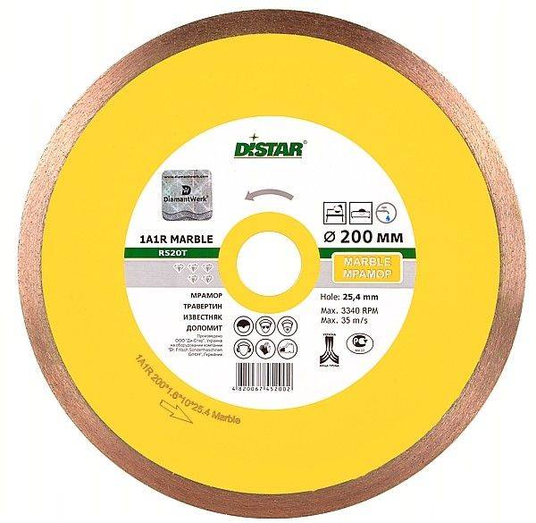 Алмазний диск DISTAR 1A1R MARBLE представлений в середній ціновій категорії, як універсальний диск для мокрого різання твердих природних матеріалів. Зокрема, використовується для обробки всіх видів мармуру, травертину і доломіту без відколів на кромці.