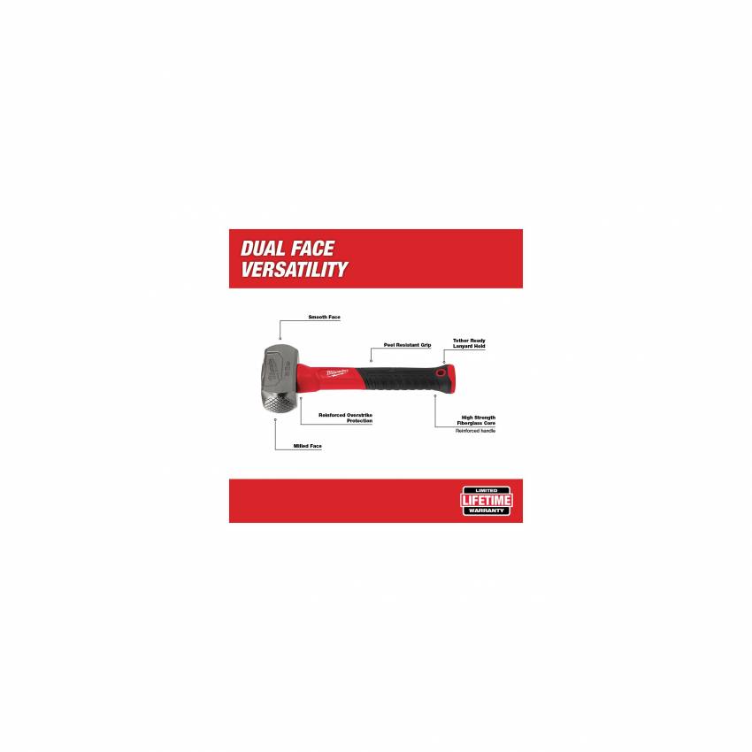 Дві грані: фрезерована грань забезпечує додаткове захоплення та мінімізує рух грані при ударі по стамесками або великим цвяхам, гладка грань запобігає пошкодженню предметів по яких здійснюється удар. Посилений захист від надмірного удару: збільшує довговічність у найпоширенішій точці відмови. Ручка зі скловолокна з м'яким покриттям: забезпечує довговічність, кращий хват і комфорт. Отвір для системи страхування. Задовольняє вимогам під час роботи на висоті.
