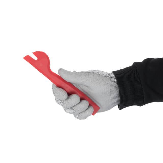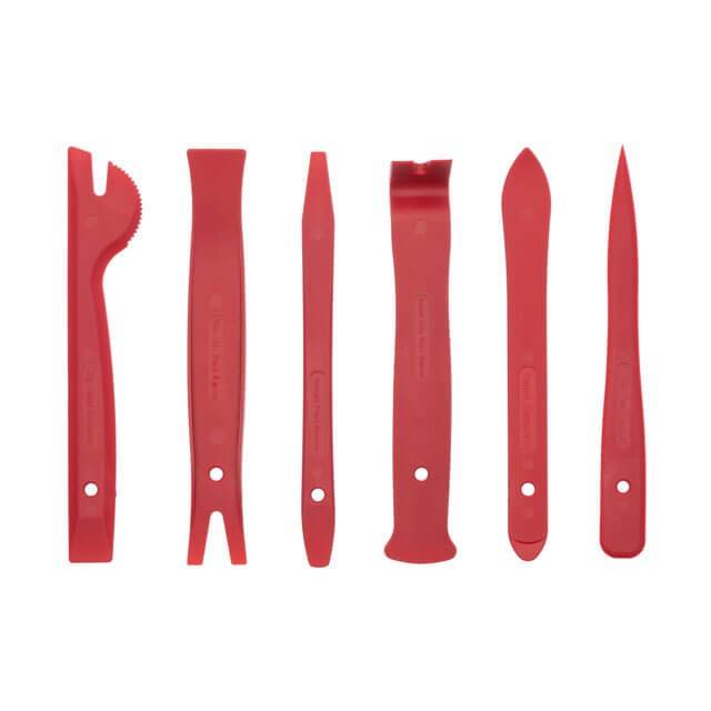 До набору входять 6 предметів різної форми: з круглими, гострими, широкими і вузькими краями, які дозволяють працювати з більшістю панелей обшивки. На знімачах є спеціальні прорізи для демонтажу кліпс кріплення.