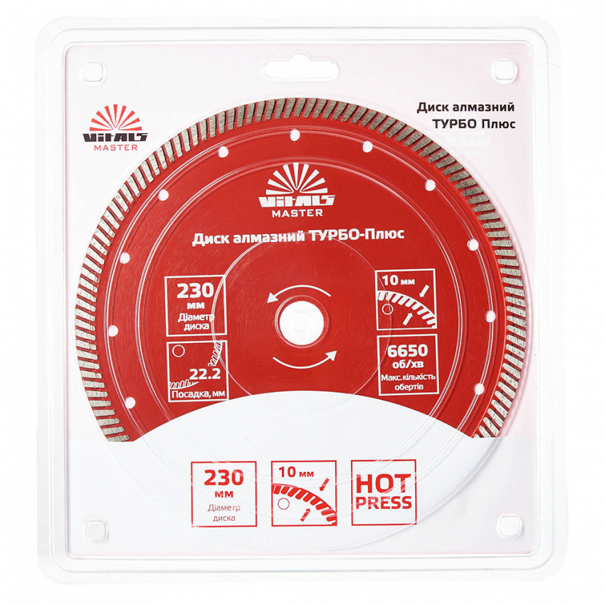 Диск алмазний Vitals Master ТУРБО-Плюс 230 мм використовується для роботи з такими матеріалами, як: бетон, цегла, граніт, залізобетон, черепиця, мармур. Висота алмазного різального шару становить 10 мм, що дає змогу використовувати круг для великого обсягу робіт.