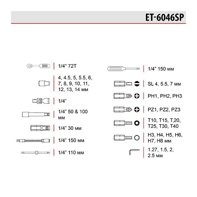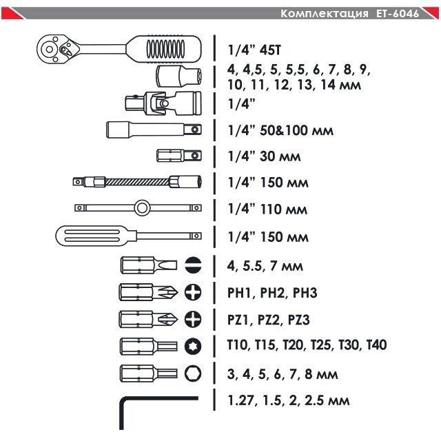 Комплектація набору з приводом 1/4” знадобиться для виконання переважної більшості робіт, пов'язаних з ремонтом обладнання, авто-, мото-, велотехніки, а також інших робіт у побуті та в гаражі домашнього майстра.
