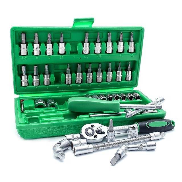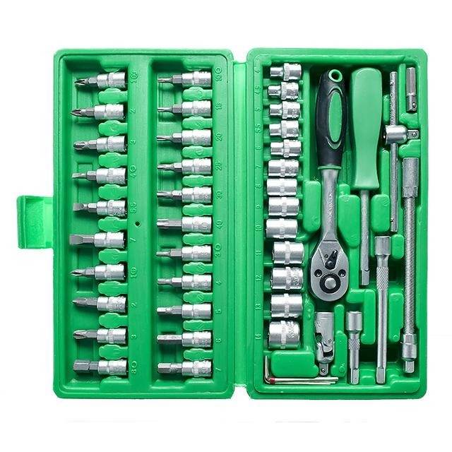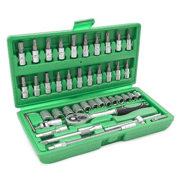 У комплекті найпопулярніші розміри торцевих головок, а також кардан, Т-подібний вороток, гнучкий подовжувач для відкручування та закручування кріплень у важкодоступних місцях. Різні типи біт стануть у пригоді для роботи зі шліцами, які часто використовують у меблевій промисловості, приладобудуванні тощо.