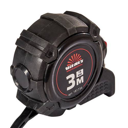 Вимірювальна рулетка гумова з нейлоновим покриттям полотна 3 м × 16 мм автостоп Vitals Professional призначена для вимірювання довжини під час проведення будівельних або ремонтних робіт.