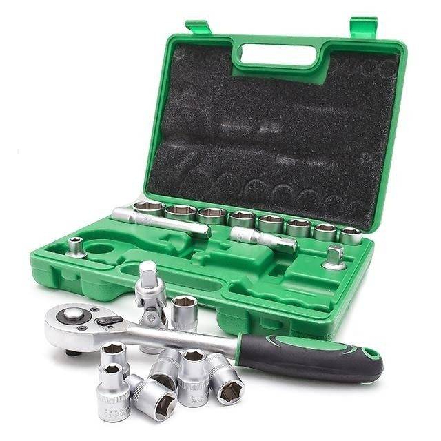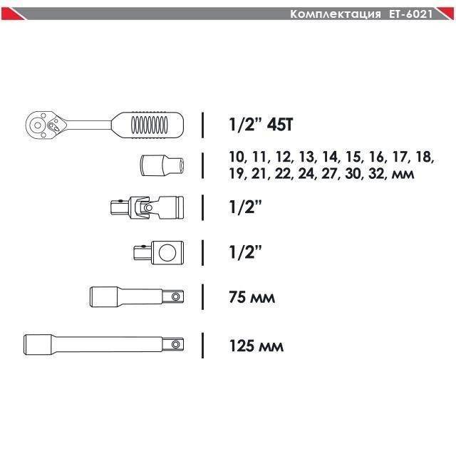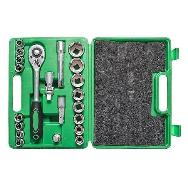 У набір включені інструменти для роботи з автомобілем, мототехнікою, велотехнікою тощо. Основою комплекту є тріскачка з приводом 1/2', шестигранні головки для виконання різнопланових робіт на закручування та відкручування кріплень. Наявність подовжувача та кардана полегшить роботу у важкодоступних місцях.