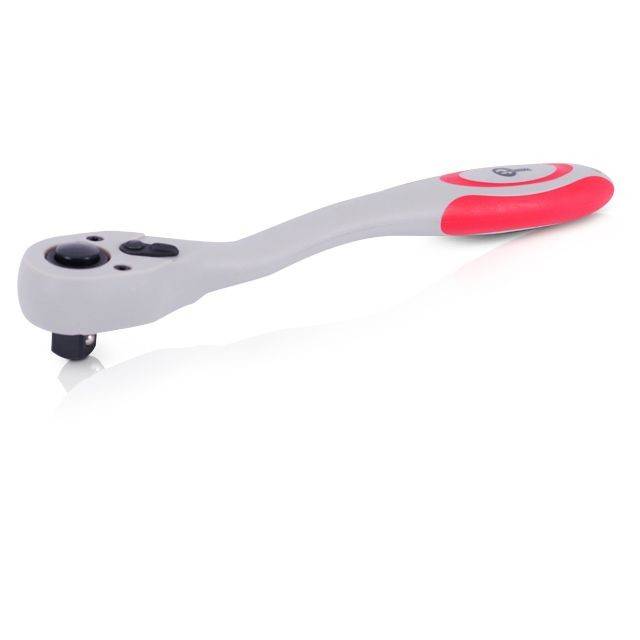 Кнопка на верхній частині тріскачки приводить фіксуючу кульку в дію й ви легко можете міняти головки, при цьому насадки міцно сидять на посадковому квадраті та не спадають. Тріскачка з храповим механізмом має зручний перемикач напрямку руху. Вигин ручки дозволяє не зачіпати поверхні інших деталей, які можуть опинитися під нею, що дуже зручно для роботи в обмеженому просторі.
