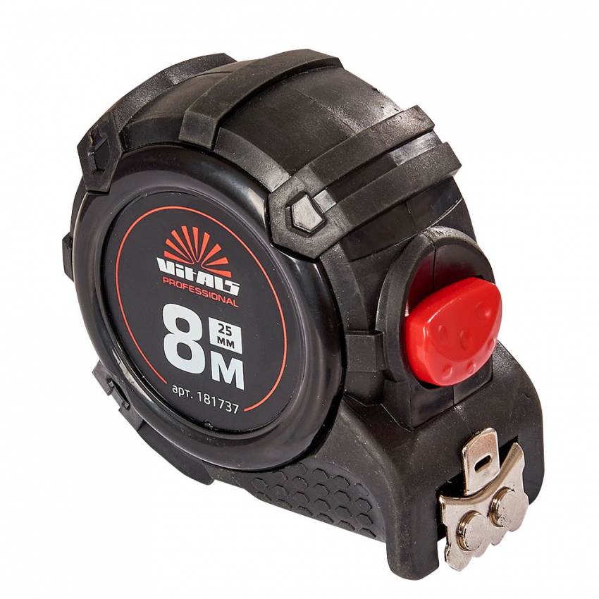 Вимірювальна рулетка гумова з нейлоновим покриттям полотна 8 м × 25 мм автостоп Vitals Professional призначена для вимірювання довжини під час проведення будівельних або ремонтних робіт.