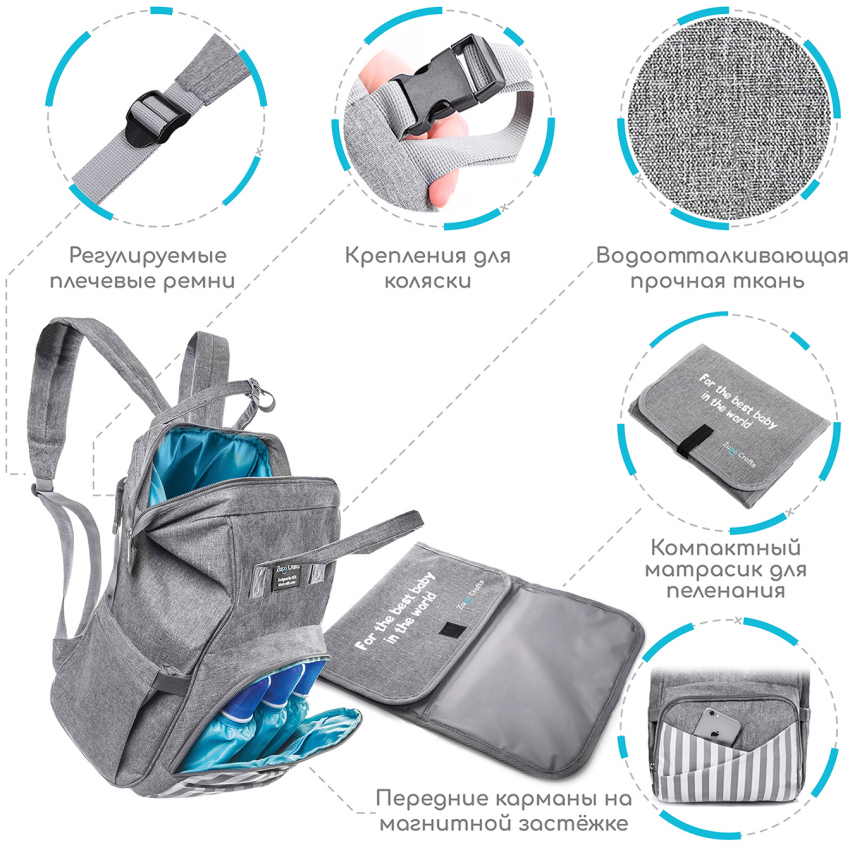 - велике відділення на міцній блискавці з п'ятьма додатковими кишенями для зручного розподілу підгузків, рушників, дитячого харчування та додаткового одягу, а також планшета чи ноутбука до 15"