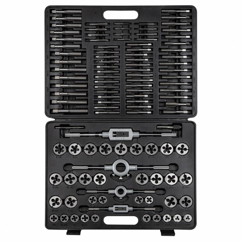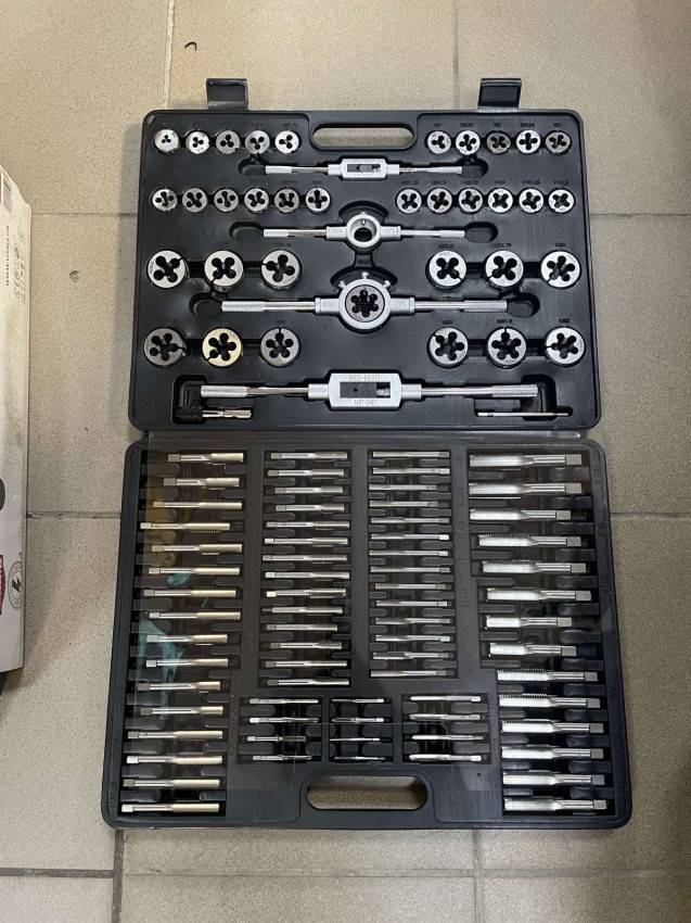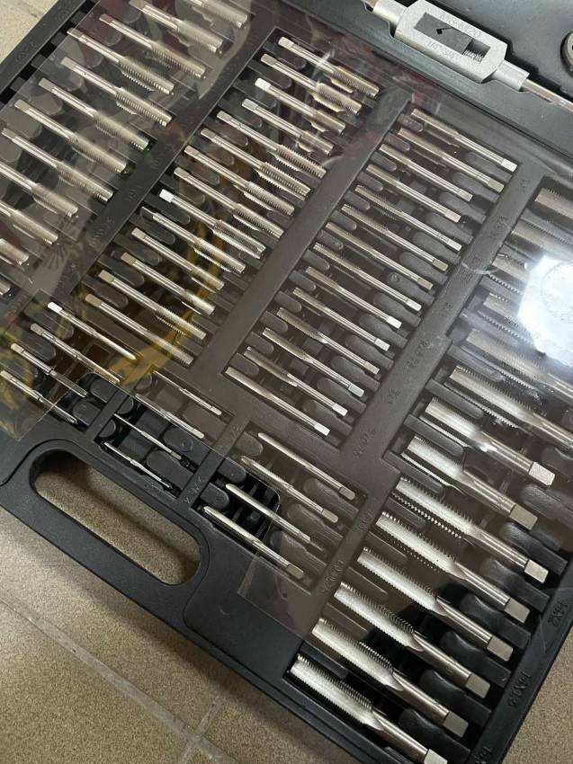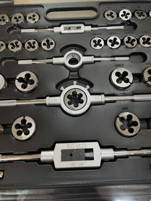 Opis techniczny | Плашки та мітчики різьбонарізні 110 найменувань: 35 пар різьбонарізних плашок: М2х0,4; М3х0,5; М4х0,7; М5х0,8; М6х0,75; М6х1,0; М7х0,75; М7х1,0; М8х0,75; М8х1,0; М8х1,25; М9х0,75; М9х1,0; М9х1,25; М10х0,75; М10х0,0; М10х1,25; М10х1,5; М11х0,75; М11х1,0; М11х1,25; М11х1,5; М12х0,75; М12х1,0; М12х1,25; М12х1,5; М12х1,75; М14х1,0; М14х1,25; М14х1,5; М14х2,0; М16х1,0; М16х1,5; М16х2,0; М18х1,5; 35 пальників: М2х0,4; М3х0,5; М4х0,7; М5х0,8; М6х0,75; М6х1,0; М7х0,75; М7х1,0; М8х0,75; М8х1,0; М8х1,25; М9х0,75; М9х1,0; М9х1,25; М10х0,75; М10х0,0; М10х1,25; М10х1,5; М11х0,75; М11х1.0; М11х1.25; М11х1.5; М12х0.75; М12х1.0; М12х1.25; М12х1.5; М12х1.75; М14х1.0; М14х1.25; М14х1.5; М14х2.0; М16х1.0; М16х1.5; М16х2.0; М18х1.52 мітчики мітчиків: М3 - М12, М6 - М202 тримачі для плашок: швидкозмінна Т-подібна рукоятка 25 мм і 38 мм для різьбонарізних головок М3 - М6. |