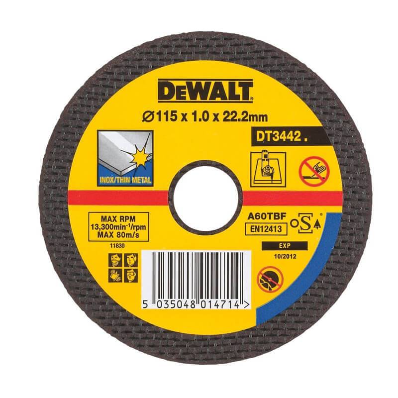 Тип диска: Абразивний; Діаметр зовнішній 115 мм; Діаметр посадки 22,23 мм; Товщина 1 мм; Застосування для різання нержавіючої сталі та чорних металів; Виробник DeWALT