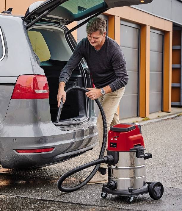 Акумуляторний пилосос Einhell TE-VC 36/25 Li S - Solo для сухого і вологого прибирання є представником сімейства Power X-Change. Він працює від двох 18 В акумуляторів. Акумулятор і зарядний пристрій Power X-Change можуть використовуватися для всіх пристроїв сімейства Power X-Change. Для оптимального використання акумуляторів передбачено 2 режими роботи: ECO і BOOST. Бак ємністю 25 літрів і телескопічна ручка вироблені з нержавіючої сталі. На корпусі розташовані вбудовані тримачі аксесуарів і дренажний клапан для зручного зливання рідини з баку. Також пилосос має функцію видування для швидкого очищення всмоктуючого шлангу і видалення сміття з важкодоступних місць. Для зручної роботи передбачені два великих колеса і два ролика. На ручці шлангу встановлений регулятор потоку повітря. Пилосос комплектується телескопічною трубкою з нержавіючої сталі, пластиковим всмоктувальним шлангом довжиною 2,5 метри, комбінованою насадокою, щілинною насадкою, насадкою для оббивки, мішком для сміття, гофрованим фільтром і поролоновим фільтром. Пилосос поставляється без акумуляторів і зарядного пристрою, вони доступні окремо. Для роботи рекомендовано використовувати акумулятори ємністю 3 Аг і більше.