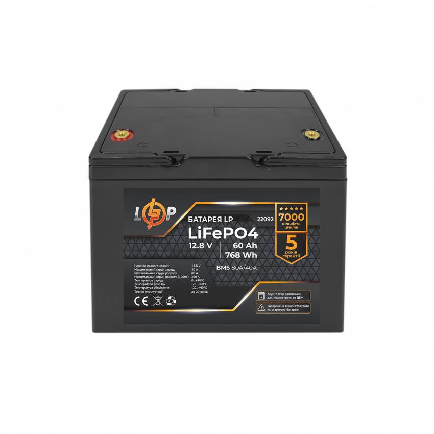 Акумулятори нового покоління LiFePO4 мають високий ККД (до 94%), низький саморозряд і широкий діапазон робочих температур (-15 ~ +60°C).