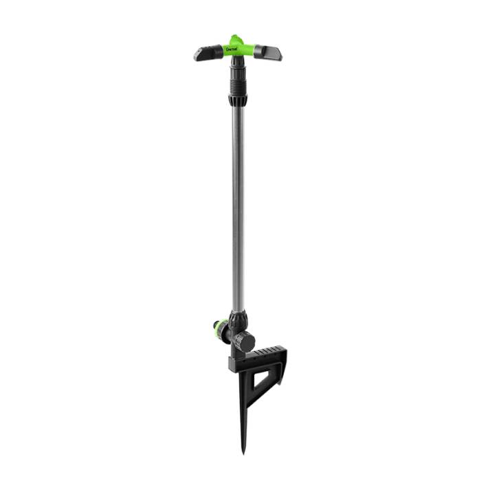 Розпилювач круговий пластиковий на штанзі довжиною 68 см використовується для стаціонарного поливу присадибних ділянок при підключенні до водопровідного шлангу за допомогою з'єднувача. Регулювання сопел дозволяє поливати певну частину присадибної ділянки. Дальність поливу до 8 м. Два сполучних гнізда дозволяють використовувати його в ланцюжку поливу з декількох розпилювачів.