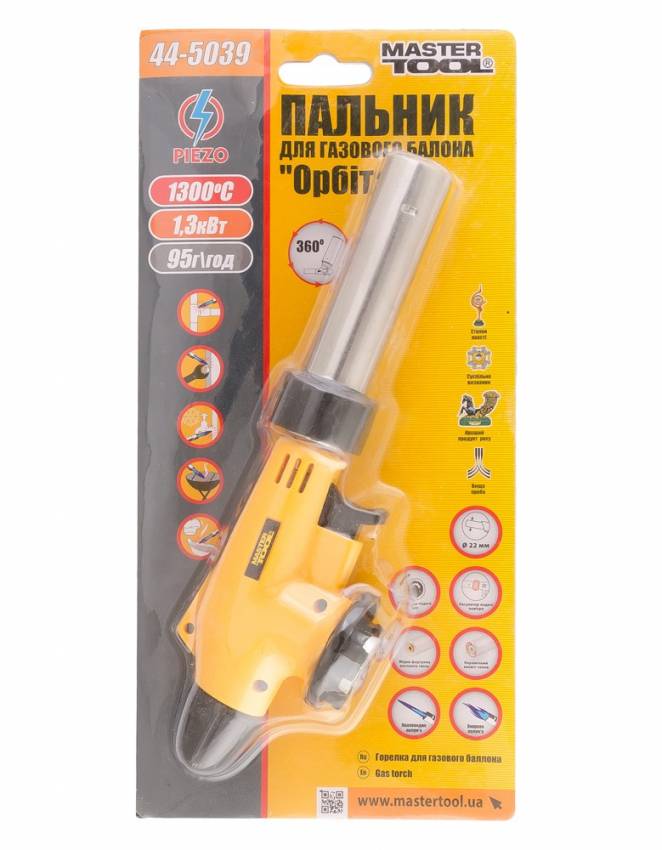 Пальник для газового балона MASTERTOOL "Орбіта" з п'єзопідпалом Ø22 мм 1300°С обертання 360° 44-5039