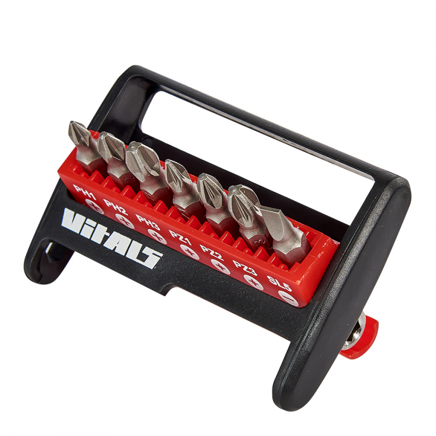 Набір біт з тримачем 32 предметів Vitals Master призначений для монтажу та демонтажу різьбових з'єднань з різними типами шліців. Довжина насадок складає 25 мм. Використовується як в ручному інструменті, так і з шурупокрутами, завдяки універсальному шестигранному хвостовику 1/4'. Є кольорове маркування біт для їх швидкого вибору. Насадки виготовлені з високоміцної сталі S2, яка відрізняється довговічністю та не схильна до руйнування. У складі цієї сталі є молібден і кремній, які надають виробу високий опір до навантажень та низький поріг оборотної деформації. Твердість сталі — 58-62 HRC. Тримач для біт виготовлений з нержавійної сталі, хвостовик із Cr-V сталі. У тримачі встановлено потужний магніт, який надійно фіксує навіть довгі біти та полегшує вкручування гвинтів. Крім магніту реалізований фіксатор, який унеможливлює випадіння біт при роботі. Насадки легко встановлюються в тримач одним натисканням, а відтягнувши назад втулку, їх легко звільнити. Такий пристрій дозволяє швидко змінювати біти та надійно їх утримувати. Усі насадки розміщені у зручному кейсі із замком. Біти та тримач мають свої окремі осередки, завдяки чому не випадають та не губляться під час транспортування.