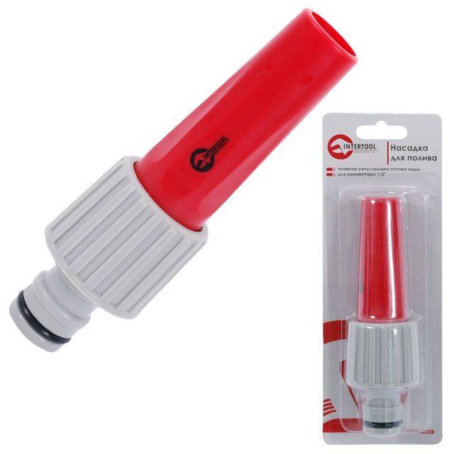 Ця розпилювальна насадка, як і пістолети для поливу, плавно регулює інтенсивність подачі води, а також форму струменя.