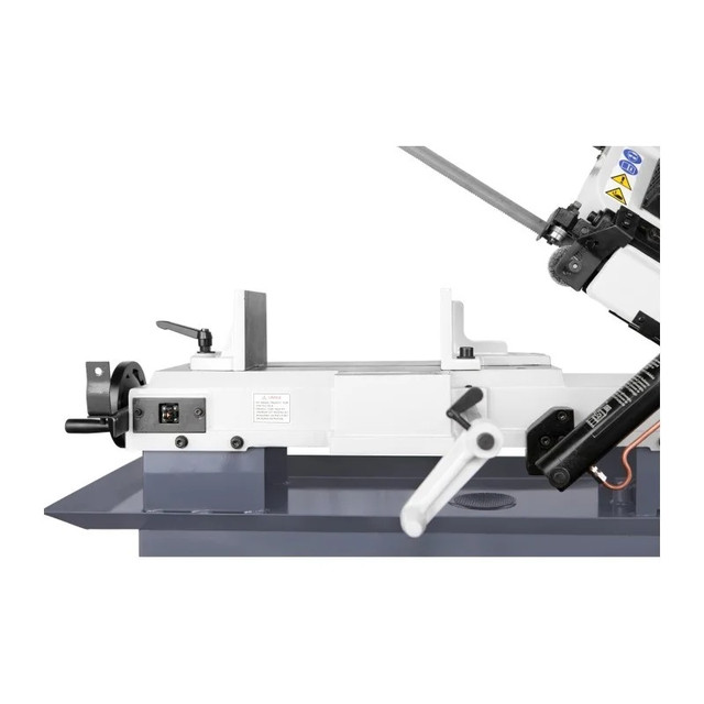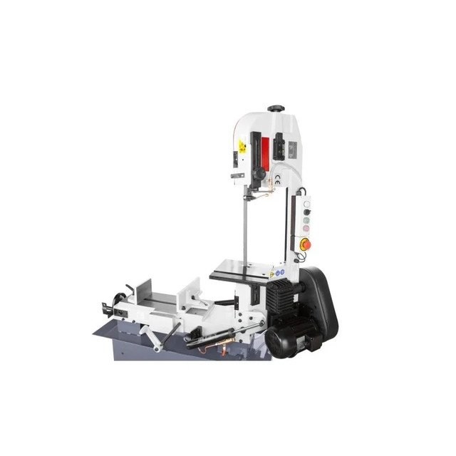 Ідеальне рішення для слюсарних і ремісничих майстерень. Система приводу ріжучої стрічки складається з двох чавунних коліс. Перше називається заводним колесом (регулювання здійснюється важелем), друге - провідним колесом. Завдяки лещатам ми можемо розрізати матеріал під кутом 0-45 градусів. На ванні встановлений чавунний робочий стіл, на якому є лещата, які утримують матеріал і до яких кріпиться пила. Внизу постаменту верстата є отвори для осі колеса. На верстаті є кінцевий вимикач, який зупиняє верстат після завершення процесу різання, аварійний вимикач.