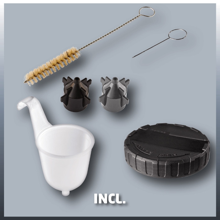 Електричний фарборозпилювач Einhell TC-SY 600 S є напівстаціонарною системою розпилення фарби для середніх і великих приміщень, пристосовану для лаків, глазурі і фарби. Регульоване сопло для вертикального, горизонтального та круглого струменів дозволяє адаптувати фарборозпилювач до різних завдань. Змінна розпилювальна головка дає можливість легко очищати всі елементи, котрі вступають в контакт з фарбою. Довгий шланг і плечовий ремінь роблять цей пристрій дуже зручним у використанні. У комплект поставки входять: два сопла для різної вязкості лаку, фарби і глазурі, резервуар для проби вязкості, щітка і голка для чищення, а також бачок для фарби об'ємом 800 мл з кришкою.