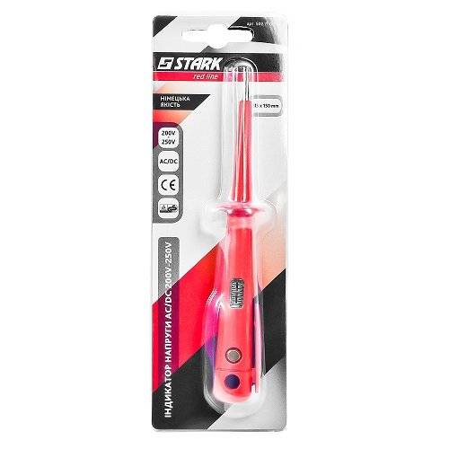 Stark AC/DC 200-250 – ручний індикатор напруги для перевірки проводки. Виявляє змінний та постійний струм від 200-250В. Світлодіодний маячок на корпусі показує наявність чи відсутність напруги.