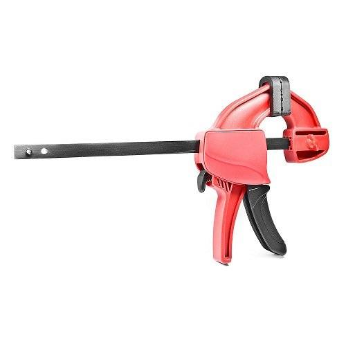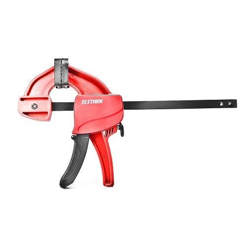 Струбцина швидкозатискна Stark 60х450 мм – інструмент для затиску та розтяжки деталей з дерева, пластику, скла, металу та ін. Використовується при будівництві, виробництві, ремонті. Швидкозатискний механізм забезпечує швидку фіксацію губок. Сталева напрямна збільшує силу затиску, а також дає змогу розтягнути та зафіксувати предмет на потрібній ширині. Можливість розтягнути заготовку від 152-642 мм. Затискні губки струбцини виготовлені TPR пластику, який м'який та гнучкий за структурою. Губки не ушкоджують поверхню деталі навіть при силі затиску до 100 кг. Легкий механізм затиску у вигляді курка дозволяє управляти інструментом однією рукою. Струбцина швидкозатискна Stark 60х450 мм виготовлена з якісних матеріалів, які мають довгий термін служби.