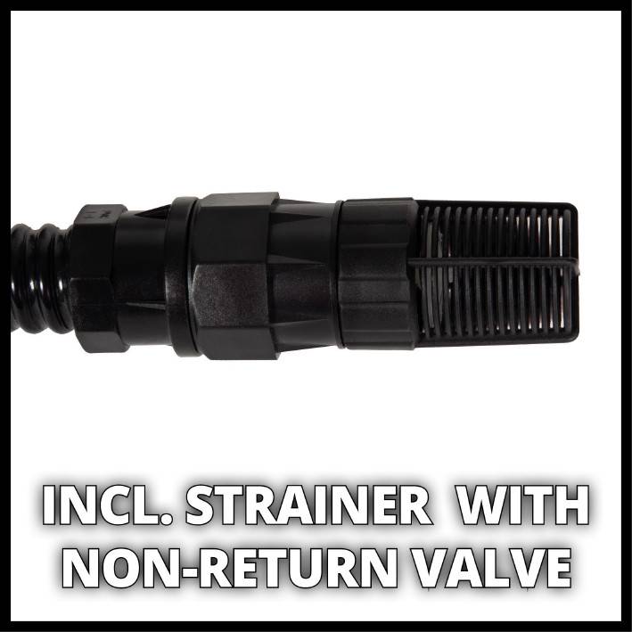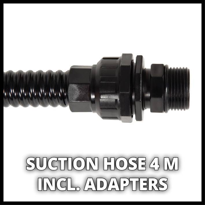 Всмоктувальний шланг Einhell — це міцний всмоктувальний шланг діаметром 25 міліметрів (1 дюйм) і довжиною 4 метри. Завдяки з’єднанню 42 мм (1 ¼ дюйма) з внутрішньою різьбою, включеному адаптеру з внутрішньою різьбою 33,3 мм (1 дюйм) і пластиковому різьбовому ніпелю з зовнішньою різьбою 33,3 мм (1 дюйм) всмоктувальний шланг Einhell підходить для садових насосів і побутових систем водопостачання або автоматичних систем водопостачання. Шланг виготовлений із твердого пластику та ідеально підходить для використання з технічною водою.