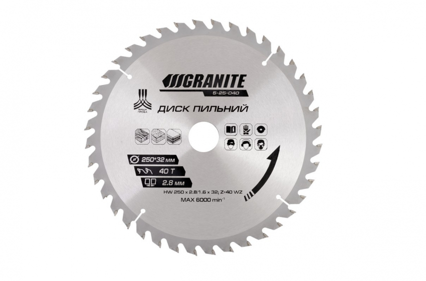 Диск пильний GRANITE для дерева з твердосплавними напайками 250х32х40Т адаптер 32-30/32-25.4 6100 об/хв 5-25-040