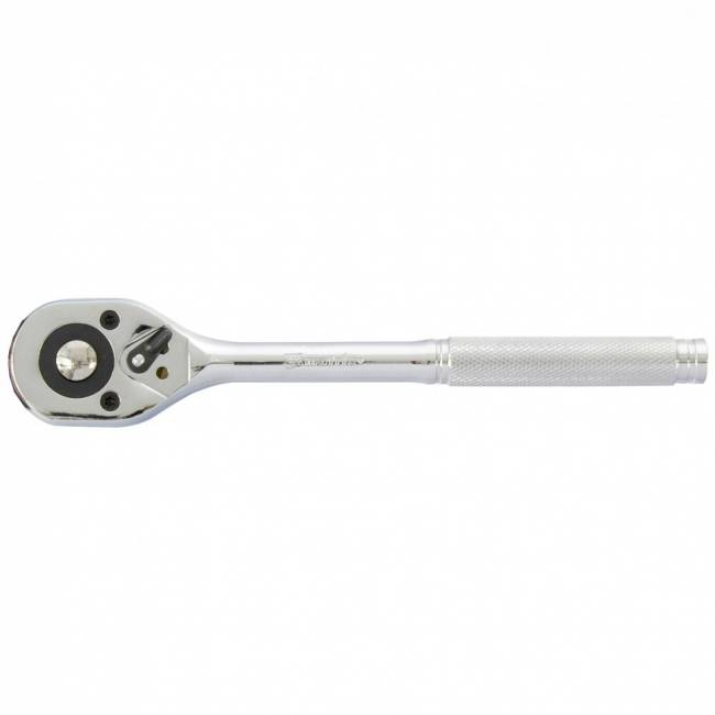 Ключ виготовлений із хромованадієвої сталі. Має антикорозійне покриття із хрому. Храповий механізм із перемикачем забезпечує плавний хід та можливість швидкої зміни напрямку обертання ключа. Приєднувальний квадрат з кульковим фіксатором надійно утримує торцеві знімні головки різних розмірів, подовжувачі, атакптери. Ключ має механізм швидкого скидання насадок. Ключ має ергономічну ручку з фрикційними ребрами, що запобігає ковзанню. Призначений для швидкого монтажу різьбових з'єднань.
