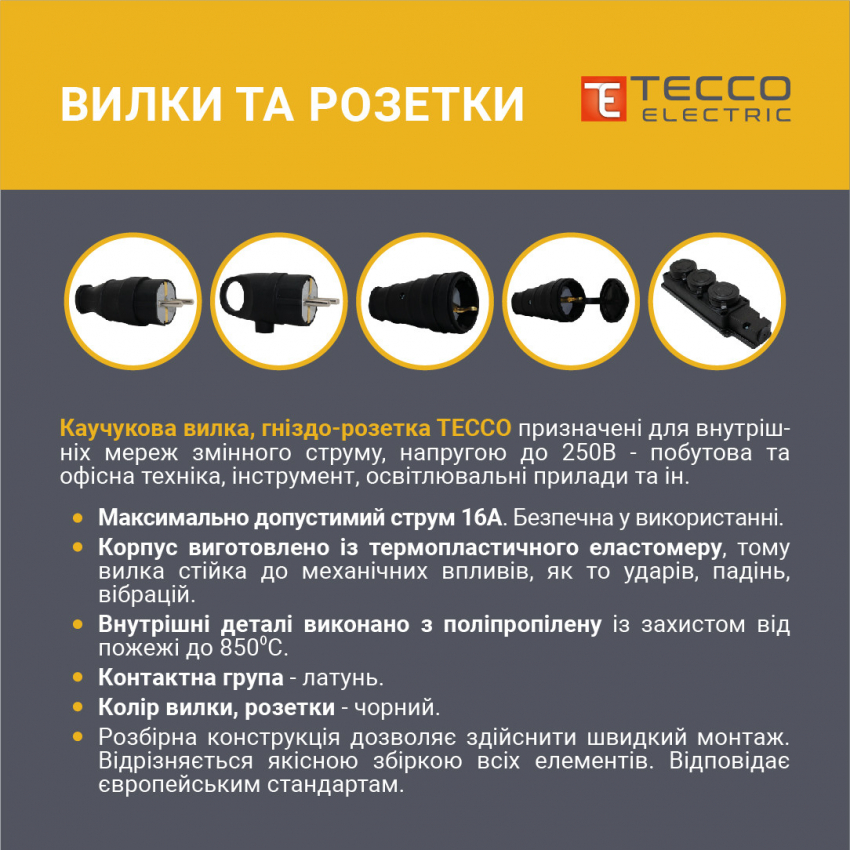Розетка з кришкою ТЕССО із заземленням 2 пости призначена для внутрішніх мереж змінного струму, напругою до 250 В — побутова та офісна техніка, інструмент, світильники та ін. Максимально допустимий струм 16 А. Безпечна у використанні, з бризкозахистом (IP44).