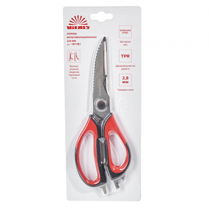 Ножиці універсальні мультифункціональні 225 мм Vitals — це незамінний багатофункціональний інструмент на вашій кухні, який підійде для розрізання різних продуктів, чищення риби, відкривання банок і пляшок, а також горіхів.