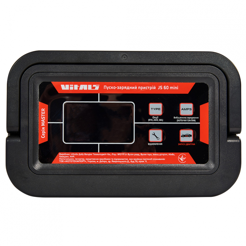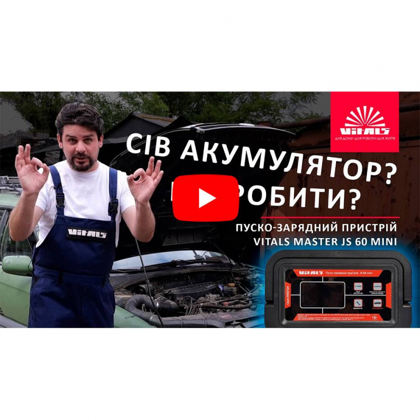 Пуско-зарядний пристрій моделі «Vitals Master JS 60 mini» призначений для заряджання свинцево-кислотних акумуляторних батарей 12 В усіх типів для транспортних засобів, іншого промислового й побутового обладнання, а також запуску двигунів транспорту з розрядженими акумуляторами. Крім того, виріб може використовуватися в якості блоку живлення приладів напругою 12 В.
