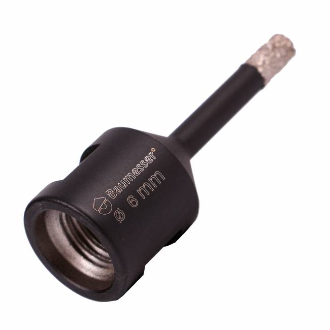 DDR M14 Keramik Pro Це PRO щвидкість! Щороку розширюється асортимент твердого, морозостійкого керамограніту, обробка якого ускладнюється. Для різання, свердління таких матеріалів потрібен швидкий інструмент. Вакуумні свердла Baumesser Keramik Pro - це швидкісні свердла для будь-яких видів кераміки та керамограніту. Високопрочний алмаз, закріплений у твердій зв’язці, формує розвинені ріжучі мікрорезці, які ефективно проникають в керамічний матеріал. Середня швидкість свердління керамограніту 10 мм на КШМ складає 7 сек (5-15 сек в залежності від твердості матеріалу). Ресурс становить 20-70 отворів. Рекомендується встановлювати швидкість КШМ у діапазоні 8000-11 000 об / хв. Свердління проводити у сухих режимах, погойдуючими рухами, уникаючи тиску на свердло. Виготовляється в діапазоні діаметрів 6-70 мм. Застосовується на КШМ 125 і 115 мм.