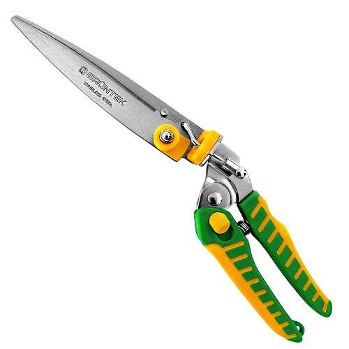 Gruntek Eisvogel 345 мм – ножиці для підстригання трави біля бордюрів, садових доріжок, клумб та огорож де немає можливості підстригти газонокосаркою. Леза ножиць для трави Eisvogel 345 мм виготовлені з нержавіючої сталі, завдяки чому забезпечують інструмент довгий термін служби, добре очищаються, не зажовують траву. Ріжуча головка повертається на 180° для зручного використання у важкодоступних місцях. Довжина леза 160 мм забезпечує високу площу захвату для швидкого виконання робіт. Рукоятки виготовлені із міцного пластику з прогумованим покриттям для комфортної роботи протягом тривалого часу. Пружинний механізм полегшує роботу із інструментом. На рукоятці передбачено кнопку фіксації для зберігання інструменту в складеному вигляді. Gruntek Eisvogel 345 мм – поворотні ножиці для трави швидко приведуть ваш сад у доглянутий вигляд.