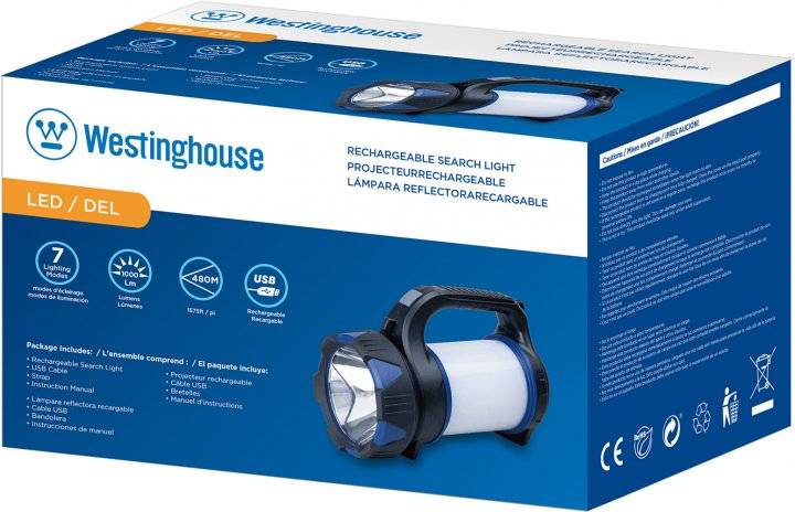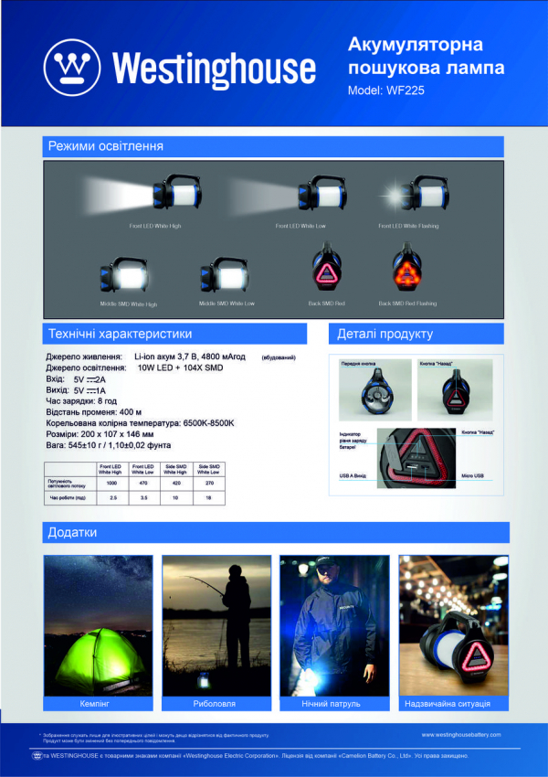 Ліхтар пошуково - кемпінговий Westinghouse 10W LED WF225 з функцією Power Bank Ліхтар пошуковий кемпінговий Westinghouse WF225 з функцією Power Bank живиться потужним вбудованим літій-іонним акумуляторним блоком, розрахований на понад 500 циклів повного перезаряджання. Потужний та яскравий світлодіод 10 ВтLED забезпечує більшу продуктивність та велику відстань променя. Ліхтар має сім режимів освітлення: пошуковий промінь макс, пошуковий промінь мін, пошуковий промінь мигаючий; світильник заливаючого світла макс, світильник мін; задній світильник червоного світла та червоне світло миготливе, для передачі сигналу тривоги іншим. Ліхтар WF225 може використовуватися як портативний зарядний пристрій, забезпечуючи додаткове джерело енергії під час невідкладних ситуацій. За допомогою USB-кабелю, що входить до комплекту, можна зарядити літій-іонний акумулятор. Наявна світлодіодна індикація рівня заряду акумулятора, що дозволить контролювати рівень заряду та бути завжди готовим до використання. Ліхтар оснащений захистом від перерозрядження та перезарядження акумулятора, забезпечуючи його використання в безпечному режимі для подовження терміну використання виробу. Джерело живлення – вбудований акумуляторний блок Li-ion 18650, 3.7В, 4800 (2х2400) мАг. Джерело світла: 10 Вт LED, 104 х SMD. Режими освітлення, СВП, час роботи: LED макс, 1000 лм, 2.5 год; LED мінім, 470 лм, 3.5 год; SMD біле світло макс, 420 лм, 10 годин; SMD біле світло мін, 270 лм, до 18 год; SMD червоне світло; SMD миготливе червоне світло. Відстань променя до 400м. Колірна температура: 6500-8500К. Вхід Micro USB: DC 5В/2A. Вихід USB: DC 5В/1А. Час повної зарядки акумулятора – 8 годин. Діапазон робочих температур: 0℃ ÷ +40℃ (60± 25%). WF225 оснащений регульований плечовим ремнем та ергономічною ручкою для різних способів використання. Це ідеальний вибір для кемпінгу, риболовлі, полювання та роботи. Понад 135 років інновацій у сфері електротехніки – інновації Westinghouse додані до кожного освітлювального приладу. * Характеристики та комплектація товару можуть змінюватися виробником без повідомлення