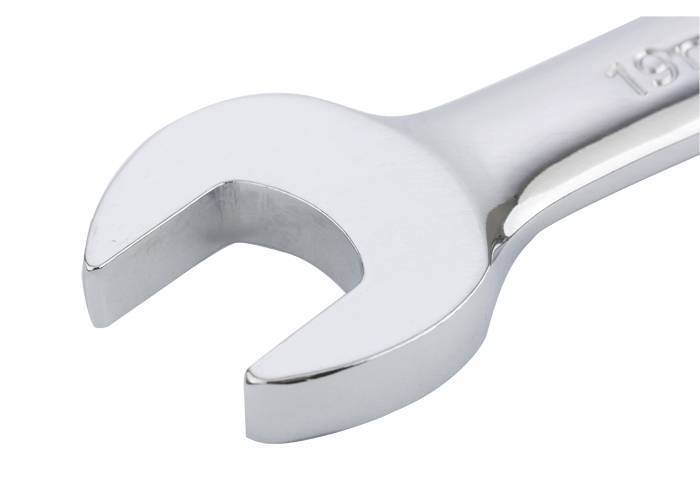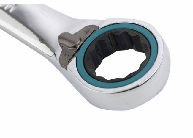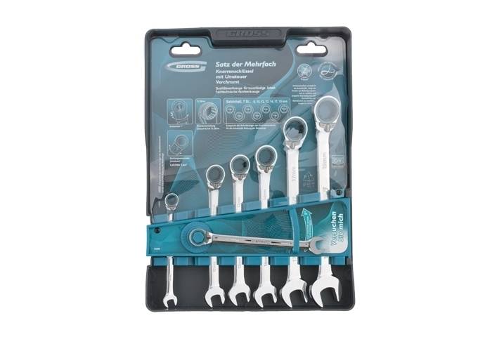 Набір комбінованих ключів торгової марки GROSS призначений для монтажу/демонтажу різьбових з'єднань. Ключі набору виготовлені із високоякісної хромованадієвої (Crv) сталі. До набору входять сім ключів розміром від 8 до 19 мм. Кожен ключ з одного боку оснащений захопленням відкритого типу – ріжковим та накидним (кільцевим) з іншого боку. Сторона з накидним типом захоплення обладнана храповим механізмом, що дозволяє проводити швидкий монтаж різьбових з'єднань. Хромонікелеве покриття ключів покращує антикорозійні властивості інструменту. Упакований набір у термоформовану плівкову коробку (double blister).
