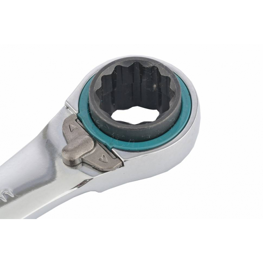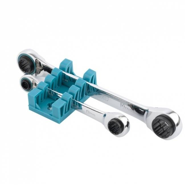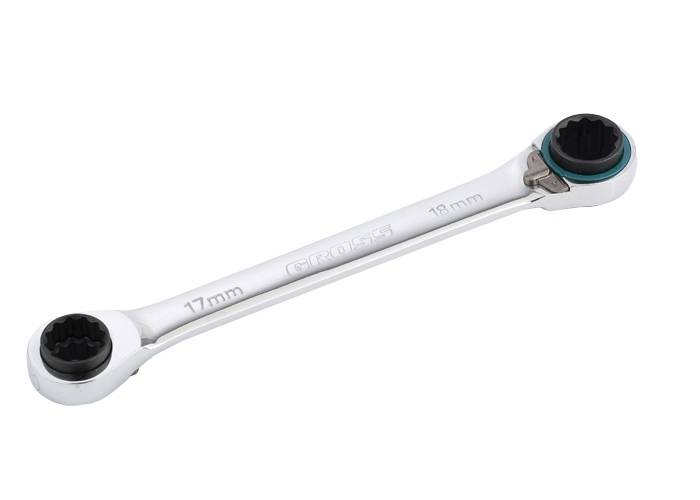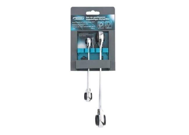 Набір накидних ключів GROSS призначений для монтажу/демонтажу різьбових з'єднань (болтів, гайок та ін.). Інструмент виготовлений із високоякісної хромованадієвої (Crv) сталі. Набір складається з двох ключів, оснащених реверсивним 72-зубчастим храповим механізмом, що дозволяє ефективно та швидко проводити роботи з різьбовими з'єднаннями. Перший ключ оснащений захватами 8 х 10 мм з одного боку та 12 х 13 мм з протилежного, другий ключ відповідно 14 х 17 мм з одного боку та 18 х 19 мм з протилежного. Мінімальний кут повороту ключа GROSS складає 5 градусів. Хромонікелеве покриття покращує антикорозійні властивості інструменту. Упакований ключ у пластикову підвісну картку є зручним для розміщення на стенді.