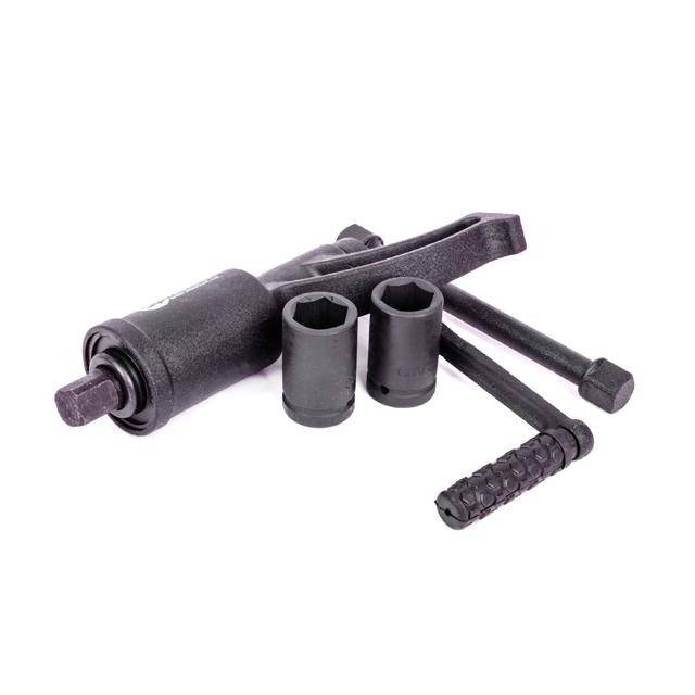 Перед початком роботи необхідно встановити ручку та обрати торцеву головку відповідного розміру. Для більш комфортної та ефективної роботи з ключем передбачена спеціальна ніжка, яка упирається в диск, забезпечуючи стабільне положення. Ручка має текстуроване покриття зі спіненого каучуку для кращої фіксації в руці.